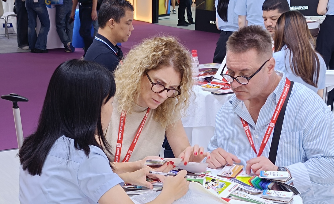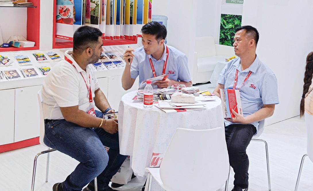 La mayoría de los clientes están interesados en tableros de espuma de PVC, vinilos autoadhesivos, productos ecológicos y en nuestros nuevos productos adhesivos magnéticos. Algunos clientes han traído sus propias muestras y esperan encontrar un proveedor adecuado.